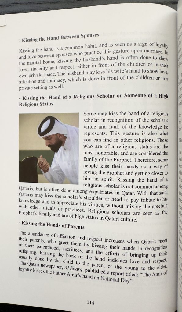 I found the book particularly enjoyable due to its excellent comparisons between Qatari signs and gestures and some Western equivalents. This comparative approach was a standout feature for me. Often, students may dismiss Arab cultural symbols as strange or extravagant, when a bit of self-reflection on their own culture (and teachers’ guidance) could foster intercultural competence and offer a better understanding.